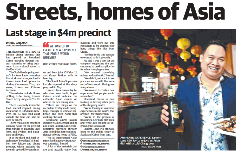 The precinct features five locally-owned kiosks, with cuisines to include Vietnamese, Thai, Japanese, Korean and Chinese barbecue.