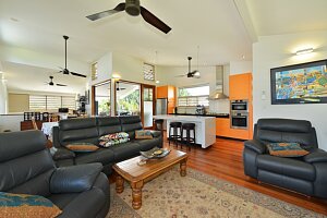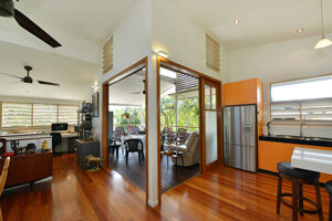 The home is designed to function well passively for the tropical climate to minimise the need for mechanical cooling. Ceiling fans are located with the aim to increase evaporative cooling and reduce reliance on air conditioning. The solar PV array and solar water heating are installed with the aim to take advantage of great solar access in tropical latitudes.