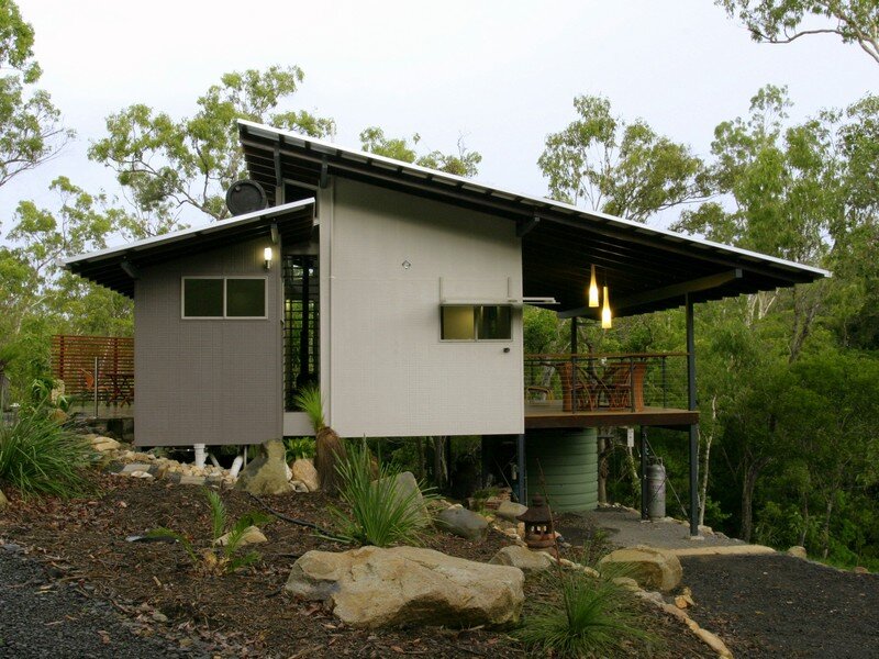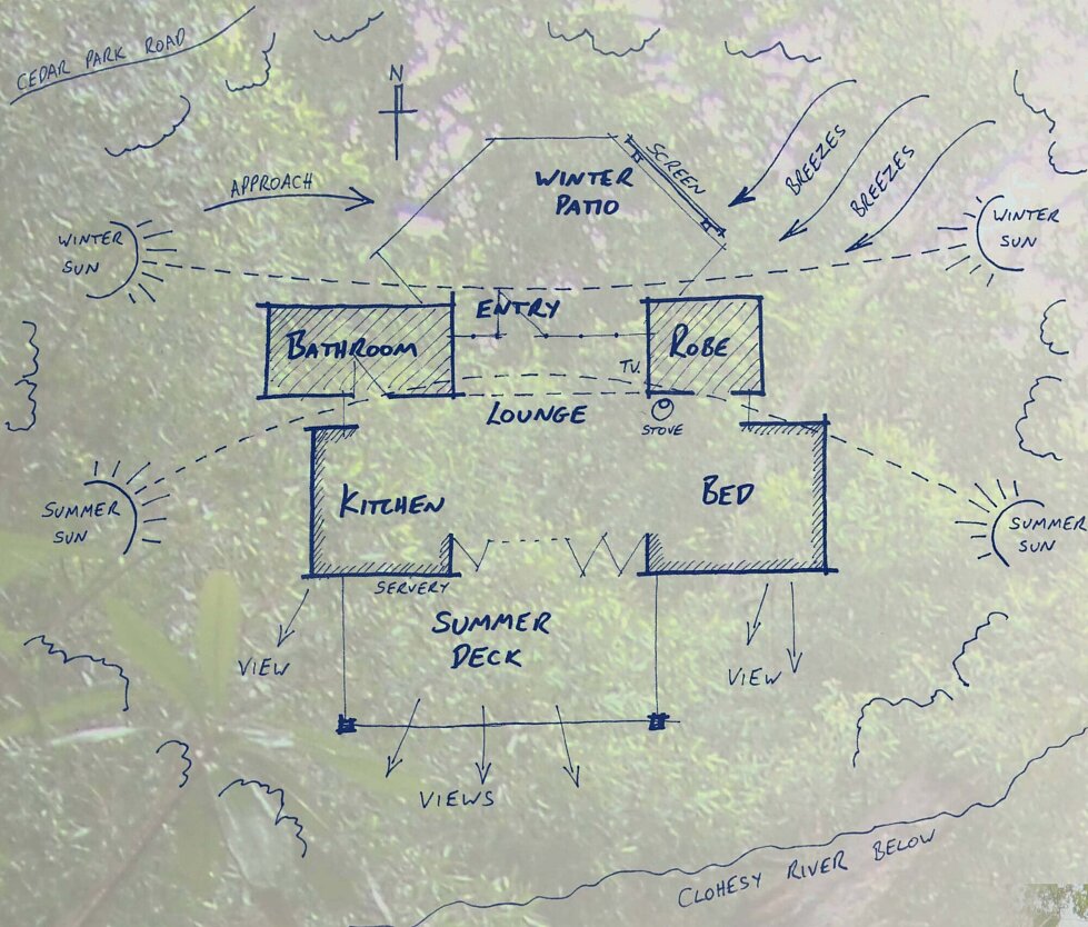 The client approached the architect with a design for a small studio dwelling to be constructed on their acreage property bordering the Clohesy River on the edge of Barron Gorge national park. The property had no mains power or water, but had an existing shed (which the clients were living in) and solar power system.