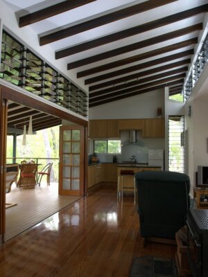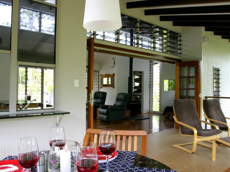 “The house is easy to clean and low maintenance. The form of the building with lots of openings and the high ceiling with louvre windows keep it cool. It works.