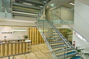 Internal fit-out materials were selected for their Green Star status. All cabinetwork and work stations were specified using zero emission board, sustainable timber veneers were chosen, low VOC paints, carpets and vinyl floors were used, and all fabrics were selected from recycled ranges. Stone tiles with various finishes and colours were chosen for the exterior and ground floor reception area. Colours were selected to reflect the exterior and RPS (Conics) new corporate livery, and a touch of style incorporated via quality artwork and feature lighting.