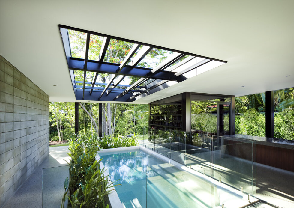 A central dappled-light filled ‘internal’ courtyard features the swimming pool as a feature garden within the main living and dining spaces.